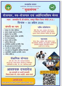 बीरबलभूमि समाचार सीधी। जिले के बेरोजगार युवक-युवतियों को एक ही स्थान पर रोजगार एवं स्व-रोजगार के अवसर उपलब्ध कराने के उद्देश्य से जिला प्रशासन के मार्गदर्शन में जिला रोजगार कार्यालय, आईटीआई एवं जिला व्यापार एवं उद्योग केंद्र सीधी के संयुक्त तत्वावधान में 30 अप्रैल 2026 को एक दिवसीय ‘युवा संगम’ रोजगार, स्वरोजगार एवं अप्रेंटिसशिप मेला आयोजित किया जाएगा। यह मेला शासकीय स्नातकोत्तर महाविद्यालय, रामपुर नैकिन परिसर में प्रातः 11 बजे से दोपहर 3 बजे तक आयोजित होगा। मेले में देश, प्रदेश एवं स्थानीय स्तर की निजी कंपनियों के साथ-साथ स्व-रोजगार से जुड़े विभागों के स्टॉल भी लगाए जाएंगे। मेले में 5वीं, 8वीं, 10वीं, 12वीं, स्नातक, स्नातकोत्तर, आईटीआई, डिप्लोमा एवं बीई/बी-टेक (विशेषकर मैकेनिकल इंजीनियरिंग) योग्यता वाले अभ्यर्थी भाग ले सकते हैं। रोजगार मेले में ग्लोबल मैनपावर सर्विसेज, स्वतंत्र माइक्रो फाइनेंस प्रा. लि., हाइटेक गियर प्रा. लि., सिनसुजा माइक्रो क्रेडिट प्रा. लि., के.के. इंटरप्राइजेज, बजाज ऑटो प्रा. लि., आदित्य बिरला (पुणे), प्रगतिशील बायोटेक प्रा. लि. (रीवा/सतना), सीआईआईएमसीसी इंदौर, एससीएन ग्लोबल प्रा. लि., एसआईएस सिक्योरिटी सर्विसेज (सिंगरौली) सहित अन्य कंपनियां भाग लेंगी। चयनित अभ्यर्थियों के लिए जॉब लोकेशन सीधी, रीवा, सतना, जबलपुर, इंदौर सहित प्रदेश के विभिन्न जिलों के अलावा अहमदाबाद, गुरुग्राम, दिल्ली, औरंगाबाद, भिवाड़ी, पुणे एवं बेंगलुरु जैसे शहरों में उपलब्ध होंगे। जिला रोजगार अधिकारी ने सभी इच्छुक अभ्यर्थियों से अपील की है कि वे निर्धारित तिथि एवं समय पर आवश्यक दस्तावेजों के साथ उपस्थित होकर इस अवसर का लाभ उठाए।