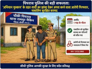 बीरबलभूमि समाचार सीधी। गुमशुदा बालक-बालिकाओं की शीघ्र बरामदगी हेतु पुलिस मुख्यालय द्वारा संचालित ‘अभियान मुस्कान’ के अंतर्गत पुलिस अधीक्षक सीधी श्री संतोष कोरी के निर्देशन, अतिरिक्त पुलिस अधीक्षक श्री अरविंद श्रीवास्तव एवं एसडीओपी चुरहट श्री रवि प्रकाश कौल के मार्गदर्शन में पिपराव पुलिस को महत्वपूर्ण सफलता प्राप्त हुई है। पुलिस टीम ने शादी एवं बेहतर जीवन का झांसा देकर अगवा की गई नाबालिग किशोरी को सुरक्षित बरामद कर आरोपी को गिरफ्तार किया है।