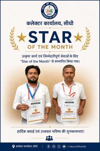 बीरबलभूमि समाचार सीधी। जिला प्रशासन द्वारा उत्कृष्ट कार्य, जिम्मेदारीपूर्ण सेवाओं एवं समर्पण के लिए दो कर्मियों को ‘Star of the Month’ से सम्मानित किया गया। स्वास्थ्य केंद्र बहरी में पदस्थ चिकित्सा अधिकारी डॉ. अमित कुमार वर्मा ने अपने कर्तव्यों का निर्वहन निष्ठा, अनुशासन एवं तत्परता के साथ किया। निरीक्षण के दौरान उनका सहयोग एवं कार्य के प्रति समर्पण सराहनीय पाया गया। इसी प्रकार बहुउद्देशीय प्राथमिक कृषि साख सहकारी समिति मर्यादित चंदवाही में तौलकर्ता श्री संपत्ति सिंह बघेल द्वारा भी अपने दायित्वों का निर्वहन जिम्मेदारी एवं लगन के साथ किया गया। उनकी कार्यशैली एवं अनुशासन की प्रशंसा की गई। जिला प्रशासन ने दोनों के कार्यों की सराहना करते हुए प्रशस्ति पत्र प्रदान किया तथा उनके उज्ज्वल भविष्य की कामना की।