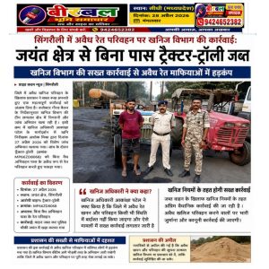 बीरबलभूमि समाचार सिंगरौली। जिले में अवैध खनिज परिवहन के खिलाफ प्रशासन ने सख्त रुख अपनाते हुए एक महत्वपूर्ण कार्रवाई को अंजाम दिया है। कलेक्टर गौरव बैनल के निर्देशानुसार खनिज विभाग की टीम लगातार क्षेत्र में निगरानी और जांच अभियान चला रही है। इसी क्रम में खनिज अधिकारी आकांक्षा पटेल के मार्गदर्शन में खनि निरीक्षक अशोक मिश्रा द्वारा दिनांक 27 अप्रैल 2026 को विशेष जांच अभियान चलाया गया। जांच के दौरान एक ट्रैक्टर-ट्रॉली (क्रमांक MP66ZD8068) को बिना वैध अभिवहन पास के अवैध रूप से रेत परिवहन करते हुए पकड़ा गया। कार्रवाई करते हुए उक्त वाहन को तत्काल जब्त कर लिया गया और सुरक्षार्थ पुलिस चौकी जयंत में खड़ा कराया गया है। खनिज विभाग द्वारा बताया गया कि जब्त वाहन के खिलाफ खनिज नियमों के तहत अग्रिम वैधानिक कार्रवाई की जा रही है। प्रशासन की इस कार्रवाई से अवैध खनिज परिवहन में संलिप्त लोगों में हड़कंप मच गया है। खनिज अधिकारी आकांक्षा पटेल ने स्पष्ट किया है कि जिले में अवैध रेत खनन और परिवहन किसी भी स्थिति में बर्दाश्त नहीं किया जाएगा और ऐसे मामलों में सख्त कार्रवाई लगातार जारी है