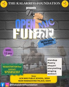 जैसा कि विधित है कि आजकल पूरे देश में युवा कलाकार नई नई उपलब्धियां हासिल करने में लगे हुए हैं और हमारे सीधी शहर में भी युवाओं के अंदर अनेकों प्रतिभाएं छिपी हैं परंतु आज भी हमारे शहर में प्रतिभा को प्रदर्शित करने के लिए उचित मंच की कमी है ऐसे में हमारे सीधी शहर के कलाकृति फाउंडेशन के सदस्यों द्वारा शहर में फनकार नामक ओपन माइक इवेंट का आयोजन 18 जनवरी 2026 रविवार को दोपहर 12:00 बजे से UCN MAS स्कूल सीधी के प्रांगण में किया जा रहा है इसके पश्चात प्रत्येक माह यह ओपन माइक स्टैंड अप इवेंट युवाओं को मंच प्रदान करने के लिए आयोजित होता रहेगा, आज इस सोशल मीडिया के दौर में प्रत्येक युवा अपनी कला को सोशल मीडिया साइट्स में प्रदर्शित करके जीवन में आगे बढ़ने के लिए सपने संजोता होता है परंतु आज भी हमारे विंध्य क्षेत्र में ऐसा मंच उपलब्ध नहीं था जहां पर युवा कलाकार अपनी प्रस्तुति दे सकें , इसी समस्या का समाधान लेकर कलाकृति फाउंडेशन के द्वारा जनवरी 2026 में मौनी अमावस्या के पवित्र अवसर पर सीधी शहर में ओपन माइक इवेंट आयोजित करके युवा कलाकारों को मंच दिया जाने वाला हैं, इस आयोजन की घोषणा होते ही शहर के कई युवा गायक, कविताकार, मिमिक्री आर्टिस्ट , लेखक और रचनाकारों में खुशी की लहर देखने को मिल रही है, और निश्चित रूप से यह आयोजन पूरे शहर के युवाओं को अपनी प्रतिभा प्रस्तुत करने के लिए बेहतर मंच दे पाएगा, आयोजकों द्वारा इस पहले ओपन माइक के कार्यक्रम को समस्त कलाकारों के लिए निशुल्क रखा गया है जिससे अधिक से अधिक कलाकार इसका हिस्सा बन सके, प्रत्येक प्रतिभागी को अपने साथ एक दर्शक लाना अनिवार्य रहेगा और बड़े शहरों के तर्ज में यह आयोजन अपने शहर के युवाओं के जीवन में भी एक नया मोड लेकर आने वाला है, कलाकृति फाउंडेशन के समस्त सदस्यों द्वारा दिन रात युवाओं से संपर्क करके इस नए कार्यक्रम से उन्हें अवगत कराया जा रहा है और कहीं ना कहीं विद्यार्थियों की परीक्षाओं को ध्यान में रखते हुए रविवार को इसका आयोजन किया गया हैं और निश्चित रूप से इस नए कार्यक्रम के आयोजित होने से भविष्य में भी शहरभर में नए-नए कलाकार अपनी प्रस्तुति देने के लिए इस ओपन माइक के मंच पर आएंगे,कलाकृति फाउंडेशन द्वारा समय समय पर भिन्न-भिन्न कार्यक्रमों के माध्यम से युवाओं को मंच देने का प्रयास किया जाता है उसी कड़ी में यह ओपन माइक इवेंट भी निश्चित रूप से युवाओं की सहभागिता के साथ सफलता प्राप्त करेगा